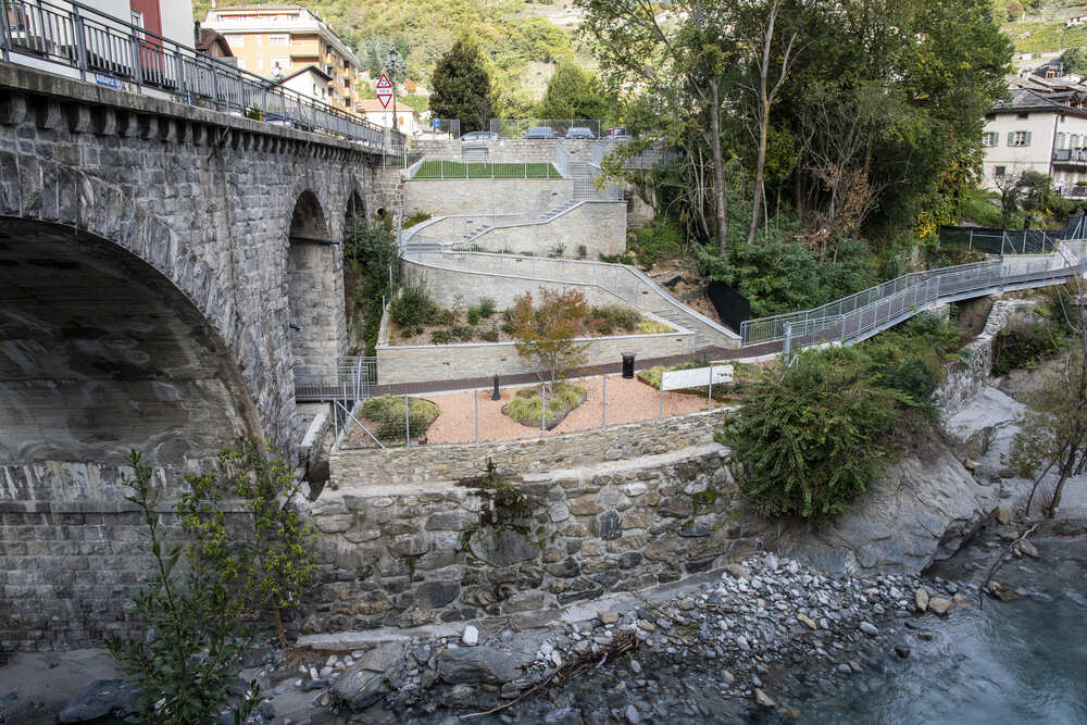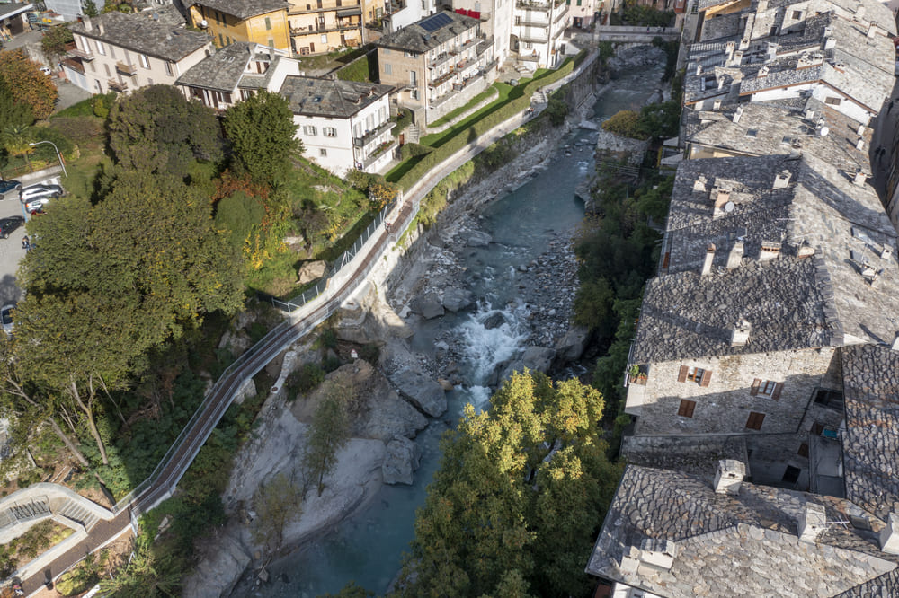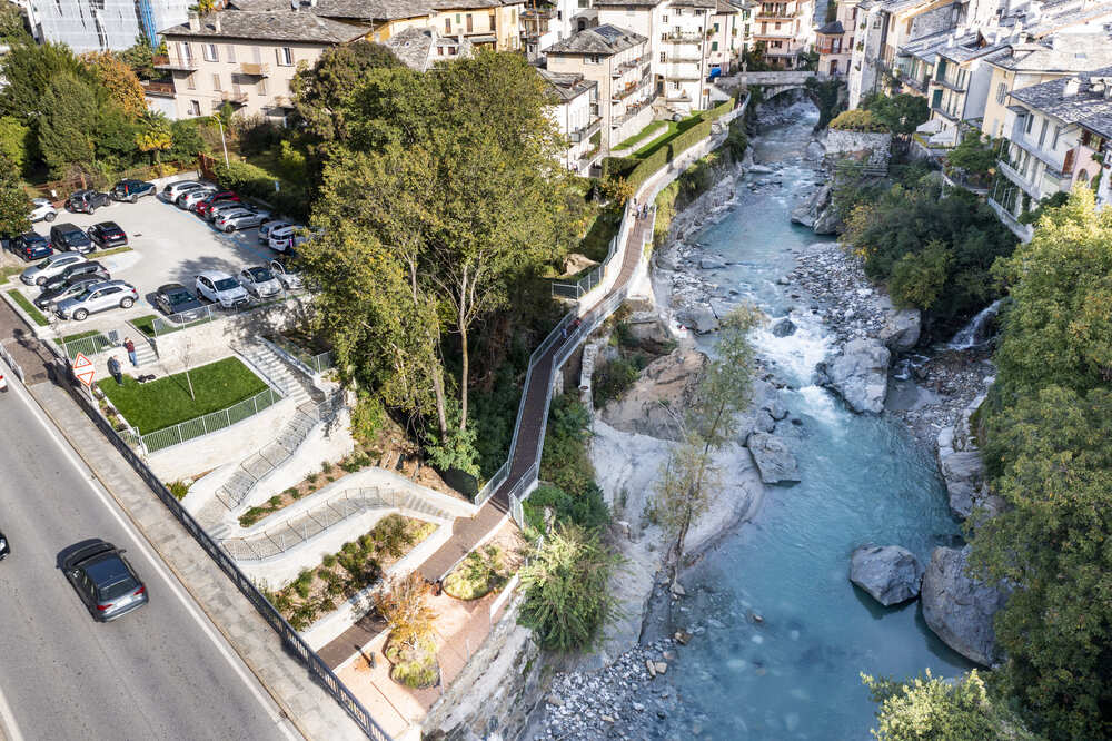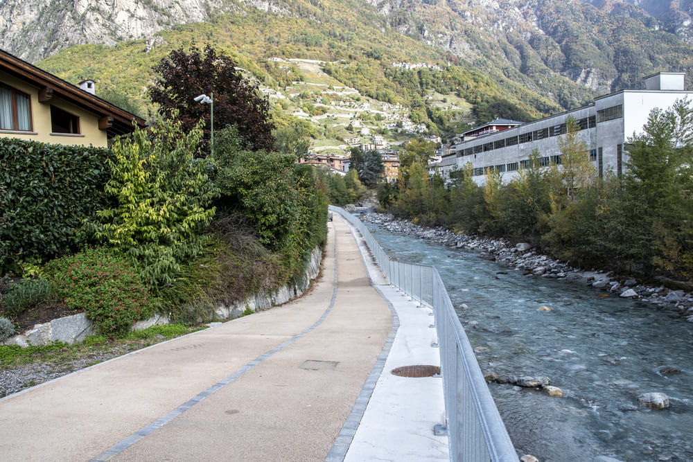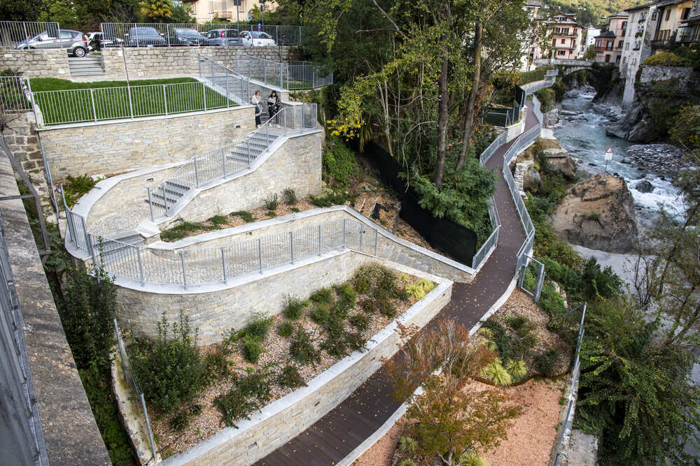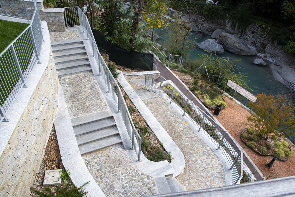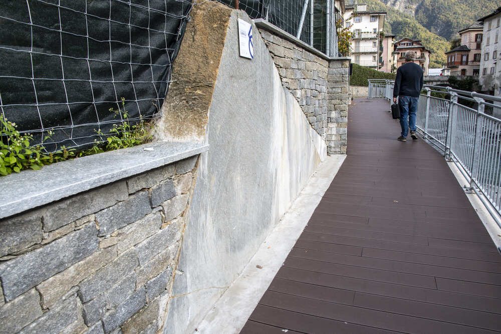 A Chiavenna, in provincia di Sondrio, TGA Costruzioni ha realizzato il nuovo tratto pedonale lungo il fiume Mera e il collegamento dei tre ponti, con muretti di collegamento tra il parcheggio del campo sportivo e il centro città, scale e pavimentazione in pietra di Luserna.