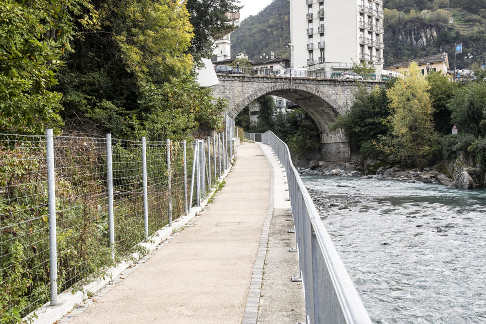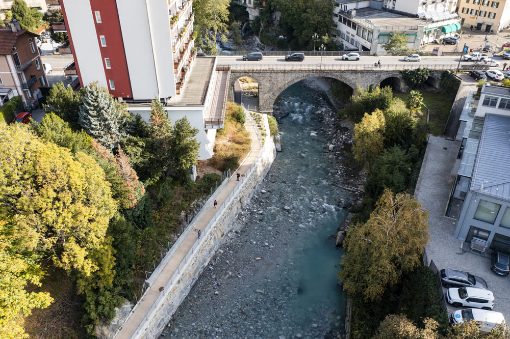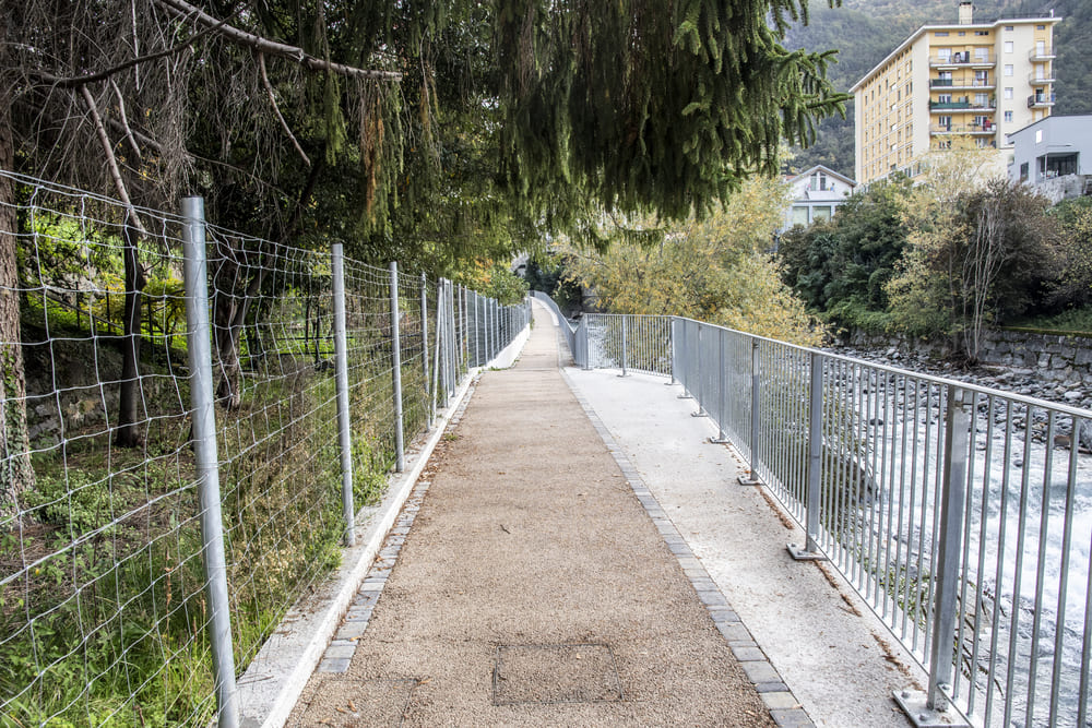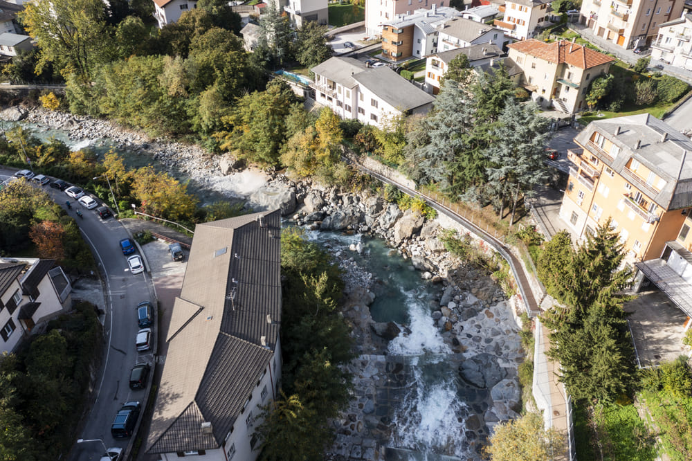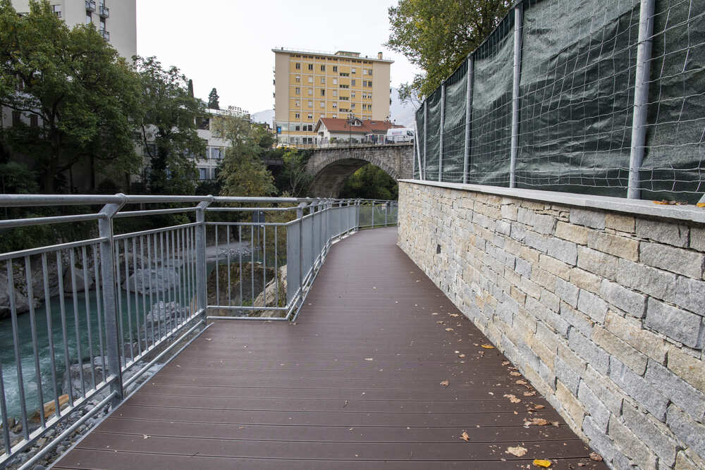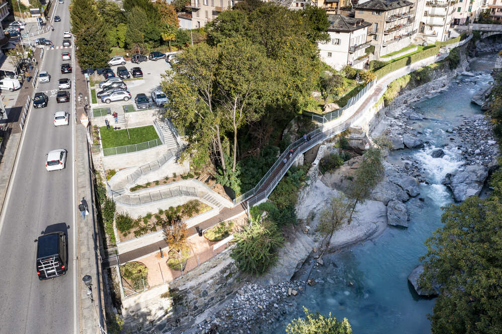 A Chiavenna, in provincia di Sondrio, TGA Costruzioni ha realizzato il nuovo tratto pedonale lungo il fiume Mera e il collegamento dei tre ponti, con muretti di collegamento tra il parcheggio del campo sportivo e il centro città, scale e pavimentazione in pietra di Luserna.